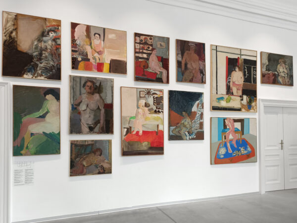 Widok wystawy „Gałganiara. Studium postaci Eufemii”, ASP w Warszawie, 16 lutego–17 marca 2024. Prace studenckie z lat 60. i 70. z kolekcji Muzeum ASP, fot. Małgorzata Orechwo.