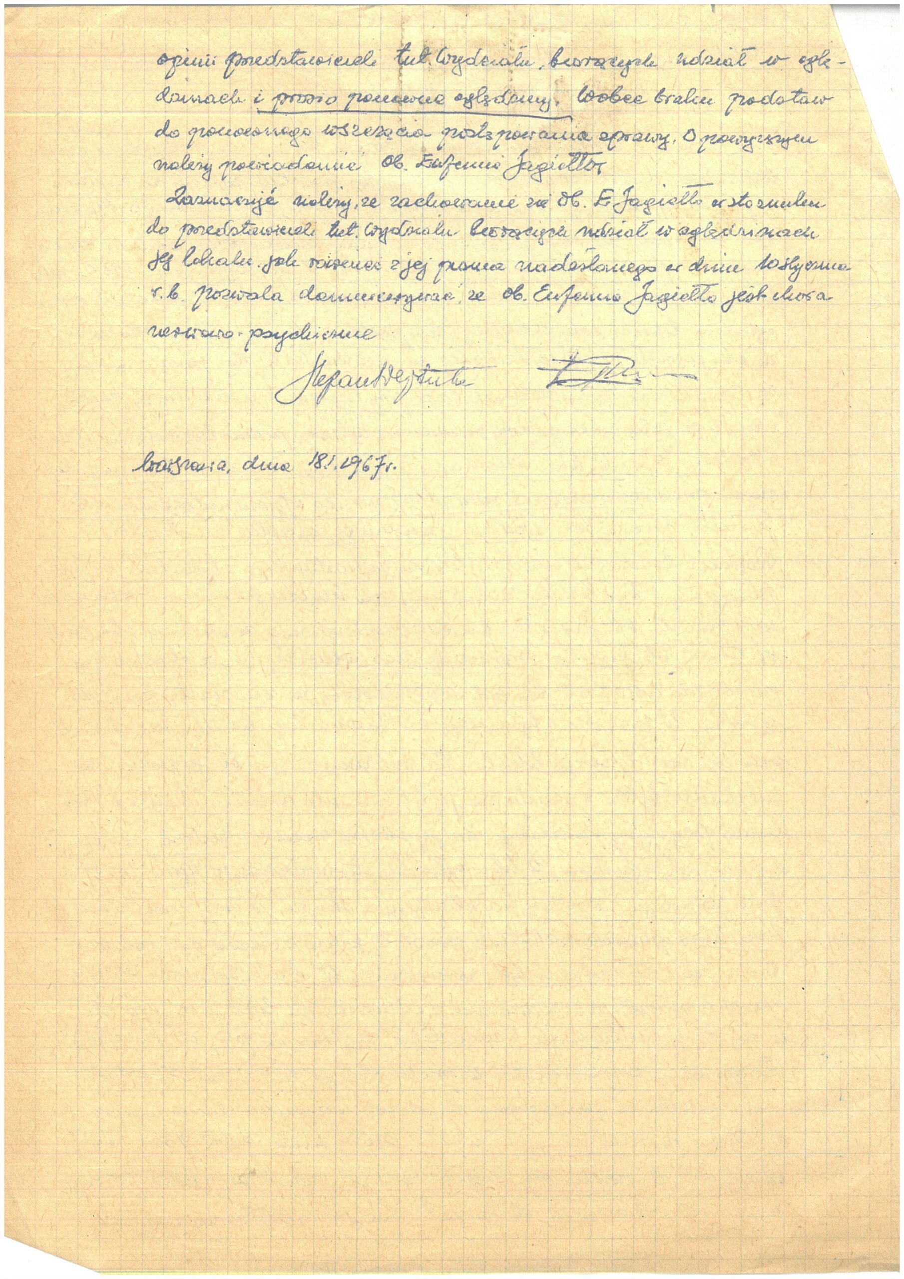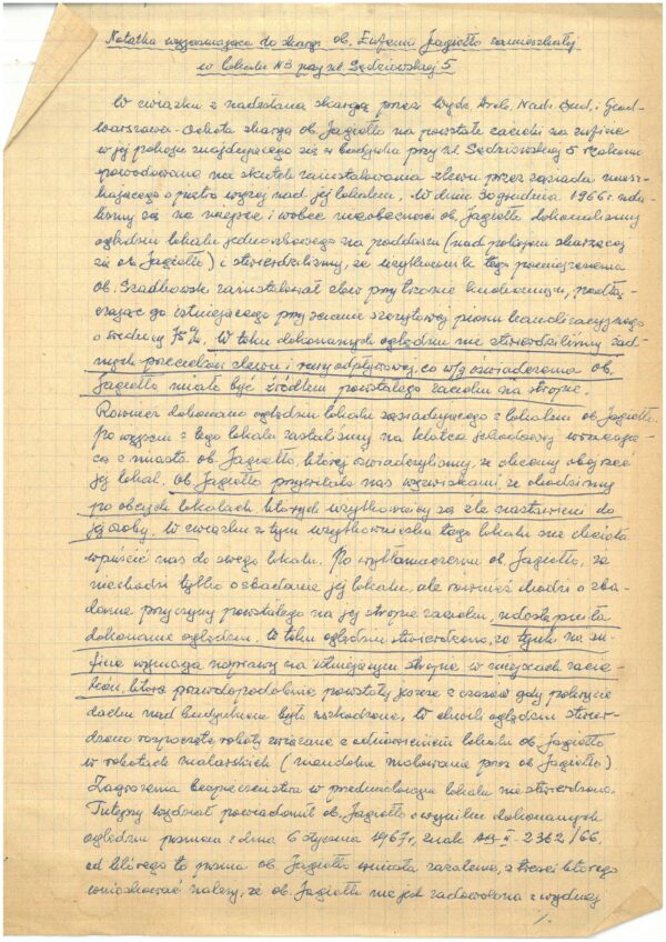 Zgłoszenia doprowadzają w końcu do inspekcji lokalu przez pracowników Wydziału Architektury Nadzoru Budowlanego i Geodezyjnego Warszawa-Ochota. Odbyła się ona 30 grudnia 1966 roku. Z wydarzenia tego, ze względu na później wniesione przez Eufemię zażalenie, została sporządzona notatka opisująca jego przebieg52. Urzędnicy nie zastali Jagiełło w domu, dokonali więc oględzin lokalu znajdującego się nad pokojem kobiety i stwierdzili, że faktycznie został w nim zainstalowany zlew, który podłączono do istniejącego już pionu kanalizacyjnego. Nie stwierdzono jednak żadnych przecieków zlewu ani rury odpływowej. Urzędnicy obejrzeli jeszcze lokal sąsiadujący z pokojem Jagiełło, a wychodząc z niego spotkali „wracającą z miasta ob. Jagiełło”. Jak zanotowano: „Ob. Jagiełło przywitała nas wyzwiskami, że chodzimy po obcych lokalach, których użytkownicy są źle nastawieni do jej osoby”53. Kobieta początkowo odmówiła wpuszczenia urzędników do mieszkania, udało się im jednak ją do tego przekonać. Zanotowali: „W toku oględzin stwierdzono, że tynk na suficie wymaga naprawy na istniejącym stropie w miejscach zacieków, które prawdopodobnie powstały jeszcze z czasów, gdy pokrycie dachu nad budynkiem było uszkodzone. W chwili oględzin stwierdzono rozpoczęte roboty związane z odnowieniem lokalu ob. Jagiełło w robotach malarskich (nieudolne malowanie przez ob. Jagiełło)”54.