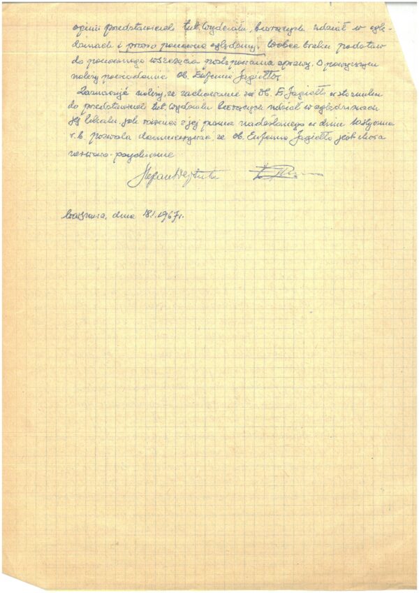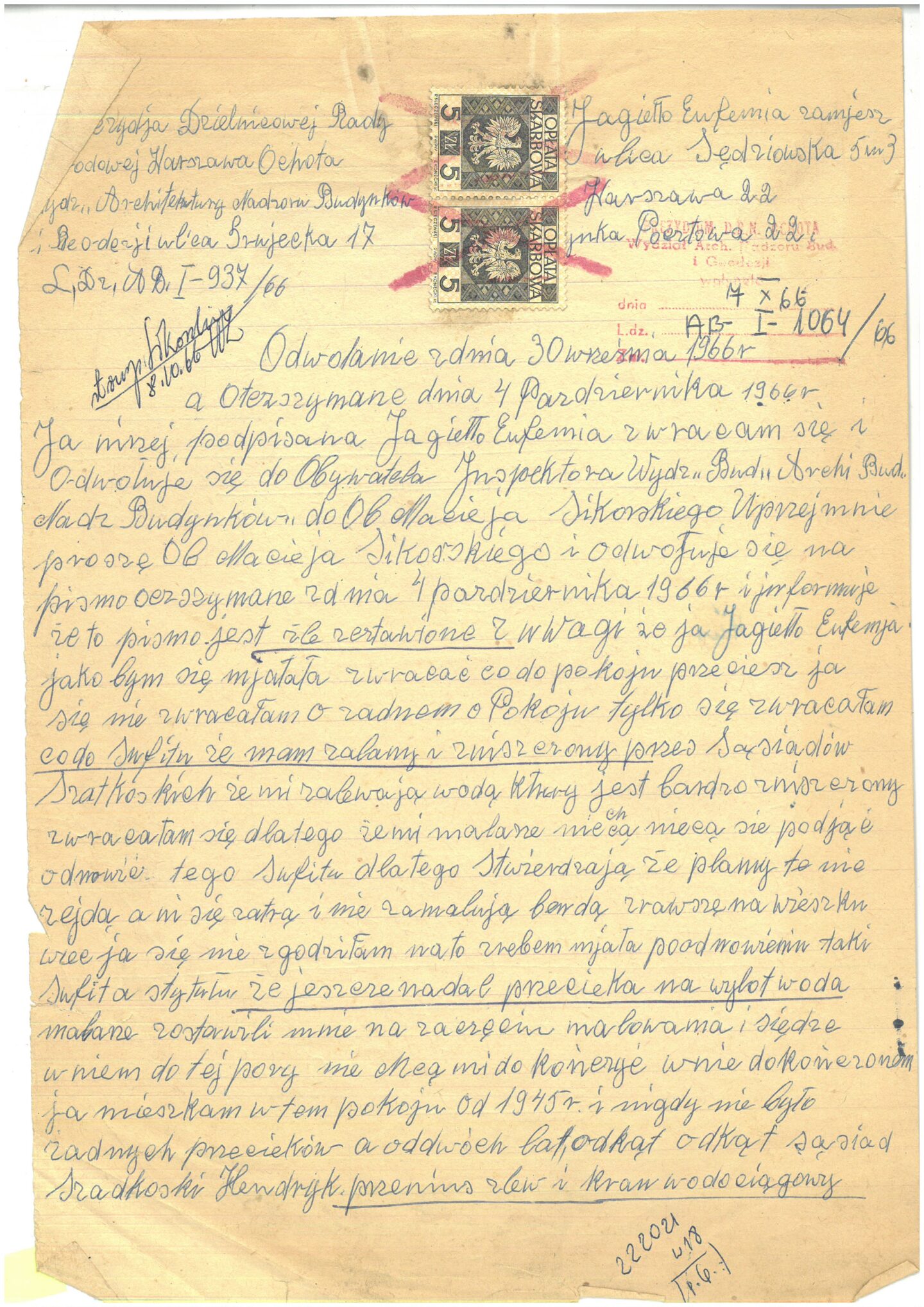 Nie wiemy, jak potoczyła się sprawa zgłoszenia, zachowana korespondencja jest niepełna. Ponad dziesięć lat później Jagiełło wciąż dręczą problemy z przeciekającym sufitem. Napisane przez nią odwołanie do odpowiedzi Wydziału Architektury zdradza gniew kobiety, litery momentami stają się pochyłe, Jagiełło podkreśla grubą kreską fragmenty, które uważa za istotne. Twierdzi, że pismo Wydziału, na które odpowiada, zawiera nieprawidłowości:
