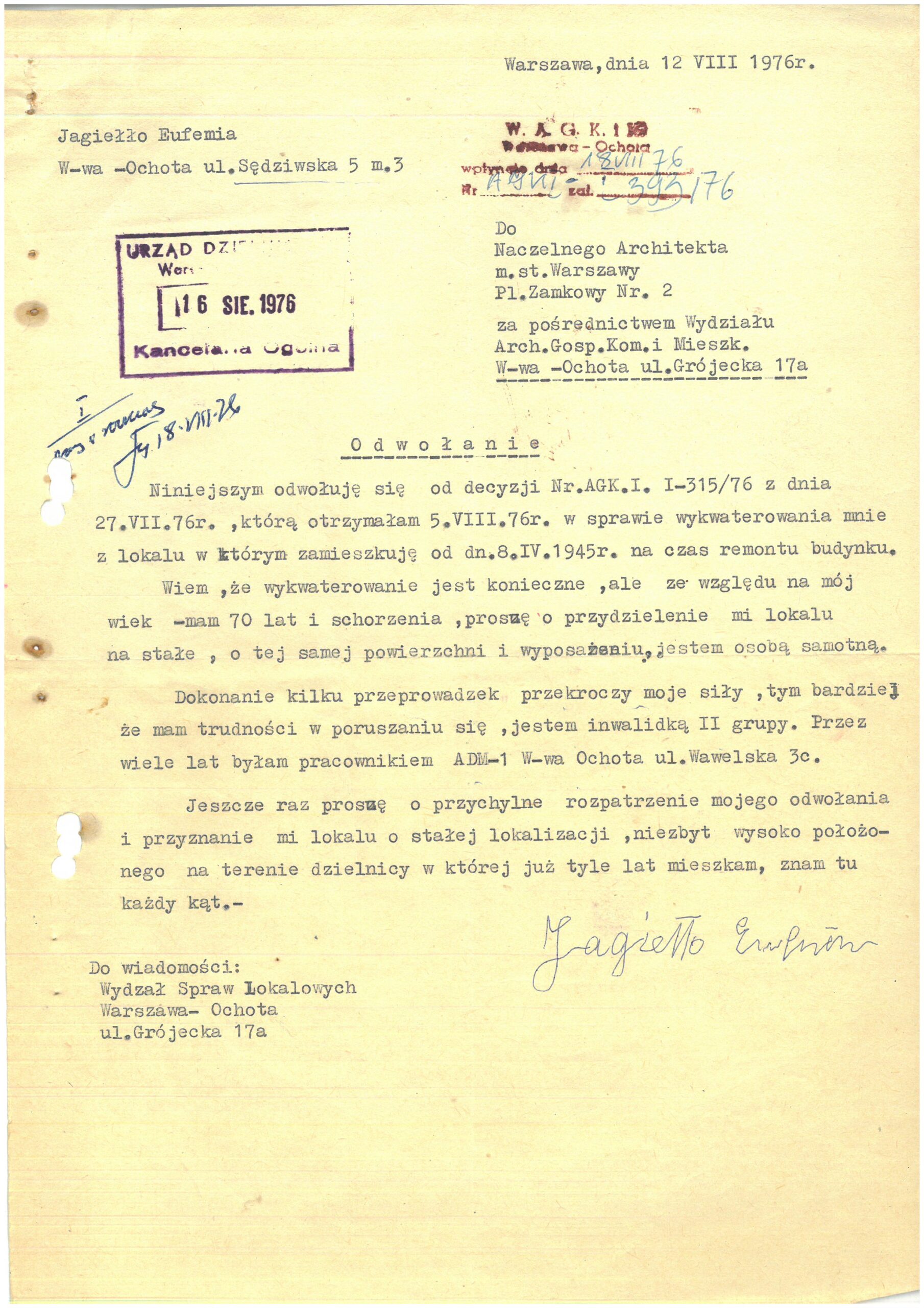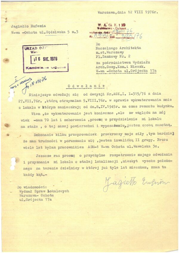 Odwołanie od decyzji nr AGK I I-315/76 z dnia 27 lipca 1976. Sygn. 19–7085, Sędziowska 5, Wydział Archiwum, biuro Organizacji Urzędu m.st. Warszawy.
