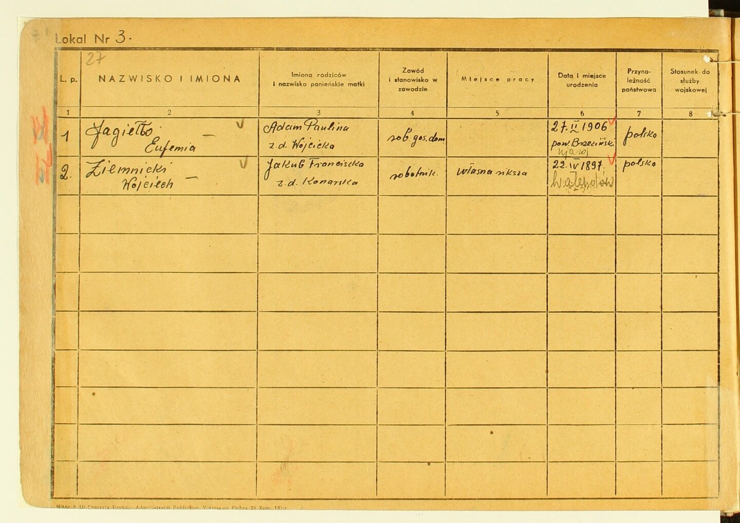 Zawód Eufemii Jagiełło w kartach meldunkowych określono jako „rob. gos. dom”25. Możliwe, że skrót ten oznacza „Robotnik Gospodarczy Domu”, czyli dozorczyni – w jednym z pism kobieta przywołuje, że przez wiele lat zatrudniona była przed administrację budynku przy ulicy Wawelskiej 3c na Ochocie26.