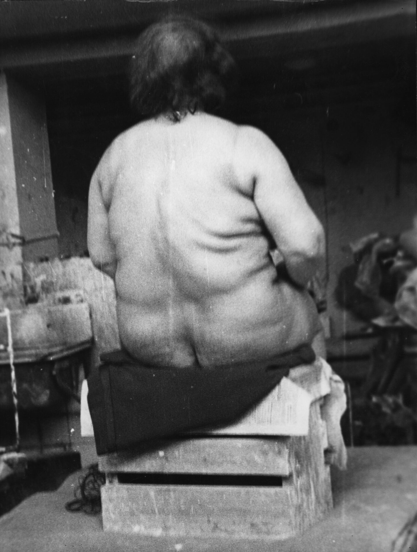 Przedstawiają one kobietę w pełnopostaciowym ujęciu. Modelka najprawdopodobniej znajduje się w pracowni rzeźby: otaczają ją gipsowe odlewy, rozpoczęte studenckie prace, stelaże i narzędzia. Eufemia Jagiełło uchwycona została w momencie pracy, podwójnie unieruchomiona przez pozę i obiektyw aparatu. Siedzi naga na prowizorycznie skonstruowanym wzniesieniu ze skrzyni, na którym, pewnie w celu zapewnienia jej choć minimalnej wygody, ułożono gazety i jakiś materiał. Znajduje się w centrum kadru, wypełnia znaczną jego część. Naturalne światło pada na jej ciało z boku, oświetlając piersi i brzuch. Nieostrość zdjęć wskazuje, że mamy do czynienia z fotografią amatorską. Eufemia ukazana jest na nich w sposób pozbawiony upiększeń, z antropologicznym realizmem. Zdjęcia wzajemnie się uzupełniają: ukazują przód i tył ciała kobiety. Prawdopodobnie powstały w celach dokumentacyjnych – być może jako pomoc w późniejszym odtworzeniu pozy modelki. Fotografie są narzędziem technicznym. To, że znajduje się na nich właśnie Eufemia jest przypadkowe, mogłyby przedstawiać jakąkolwiek inną modelkę czy modela zatrudnionych w pracowni. Co więcej, gdyby nie jej wizerunek z nagrania, potwierdzony przez dawnych studentów – nie wiedzielibyśmy kogo przedstawia. Nikomu nie przyszło do głowy ich podpisać.