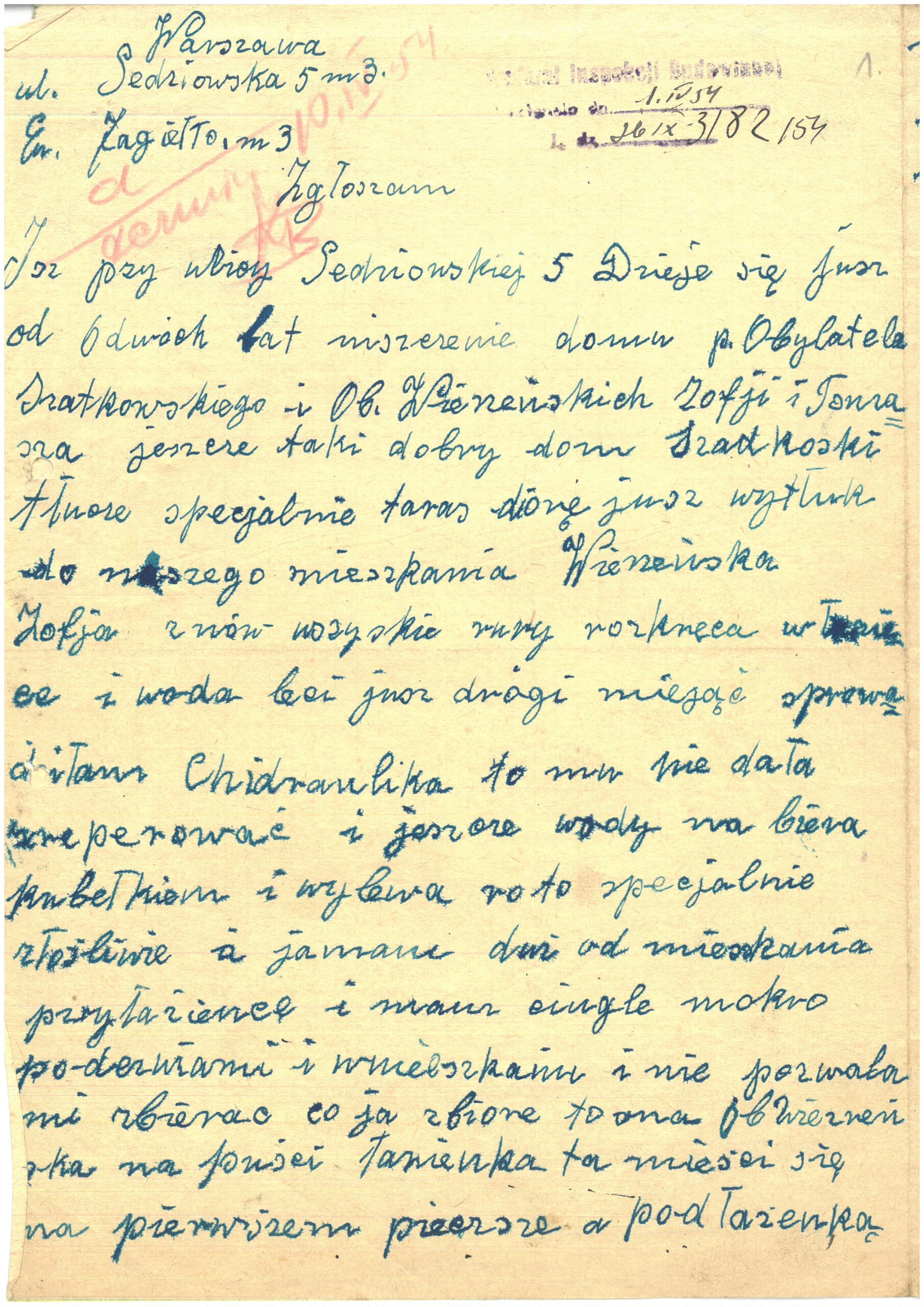 Zgłaszam Isz pzy ulicy Sedziowskiej 5 Dzieje się jusz od dwóch lat niszczenie domu p. Obywatela Szatkowskiego i Ob. Wierzeńskich Zofji i Tomasza jeszcze taki dobry dom Szadkowski tłucze specjalnie taras diórę jusz wytłuk do naszego mieszkania Wierzeńska Zofja znów wszystkie rury rozkręca w łazience i woda leci jusz drógi miesąc sprowadziłam Chidraulika to mi nie dała zreperować i jeszcze wody na biera kubełkiem i wylewa [nieczytelne] to specjalnie złośliwie a jamam dwi do mieszkania przyłazience i mam ciugle mokro po-dezwiami i wmieszkaniu i nie pozwala mi zbierac co ja zbiore to ona [nieczytelne] na puści […]47.