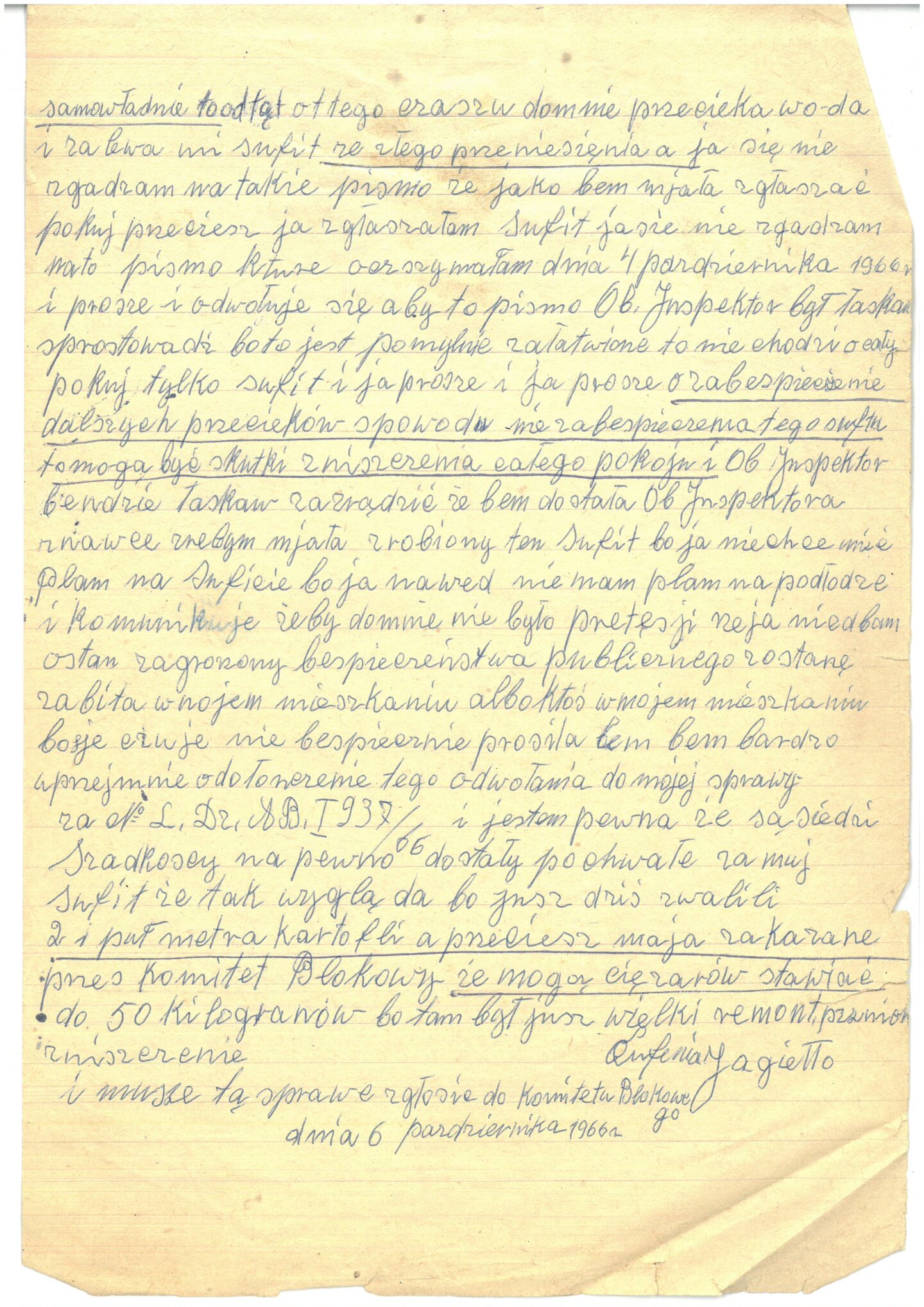 […] jestem pewna że sąsiedzi Szadkoscy na pewno dostały pochwałe za muj sufit i że tak wygląda bo jusz dziś zwalili 2 i puł metra kartofli a przecież mają zakazane przez Komitet Blokowy że mogą ciężarów stawiać do 50 kilogramów bo tam był jusz wielki remont [nieczytelne] zniszczenie i musze tą sprawę zgłosić do Komitetu Blokowego Eufemia Jagiełło51.