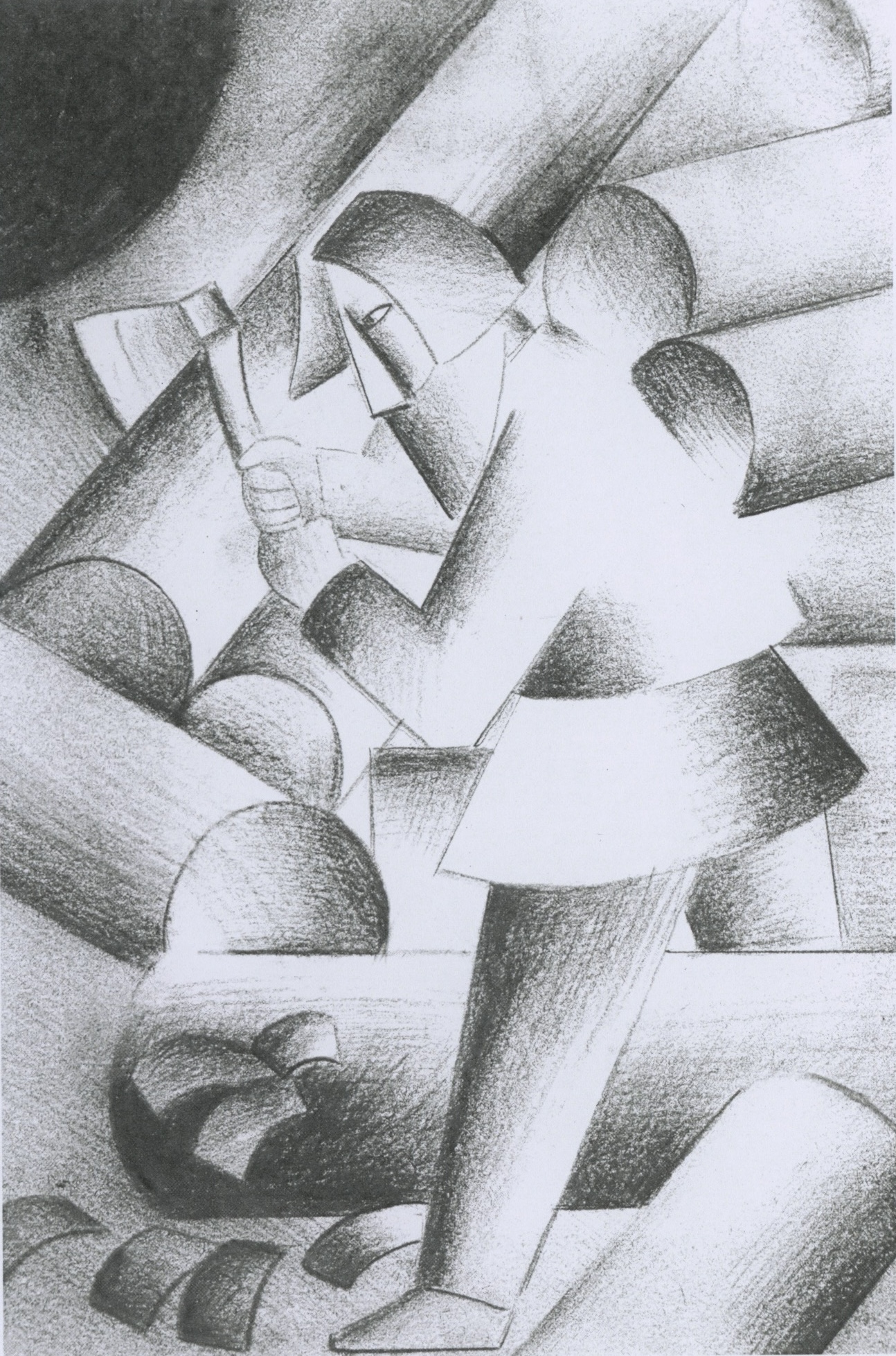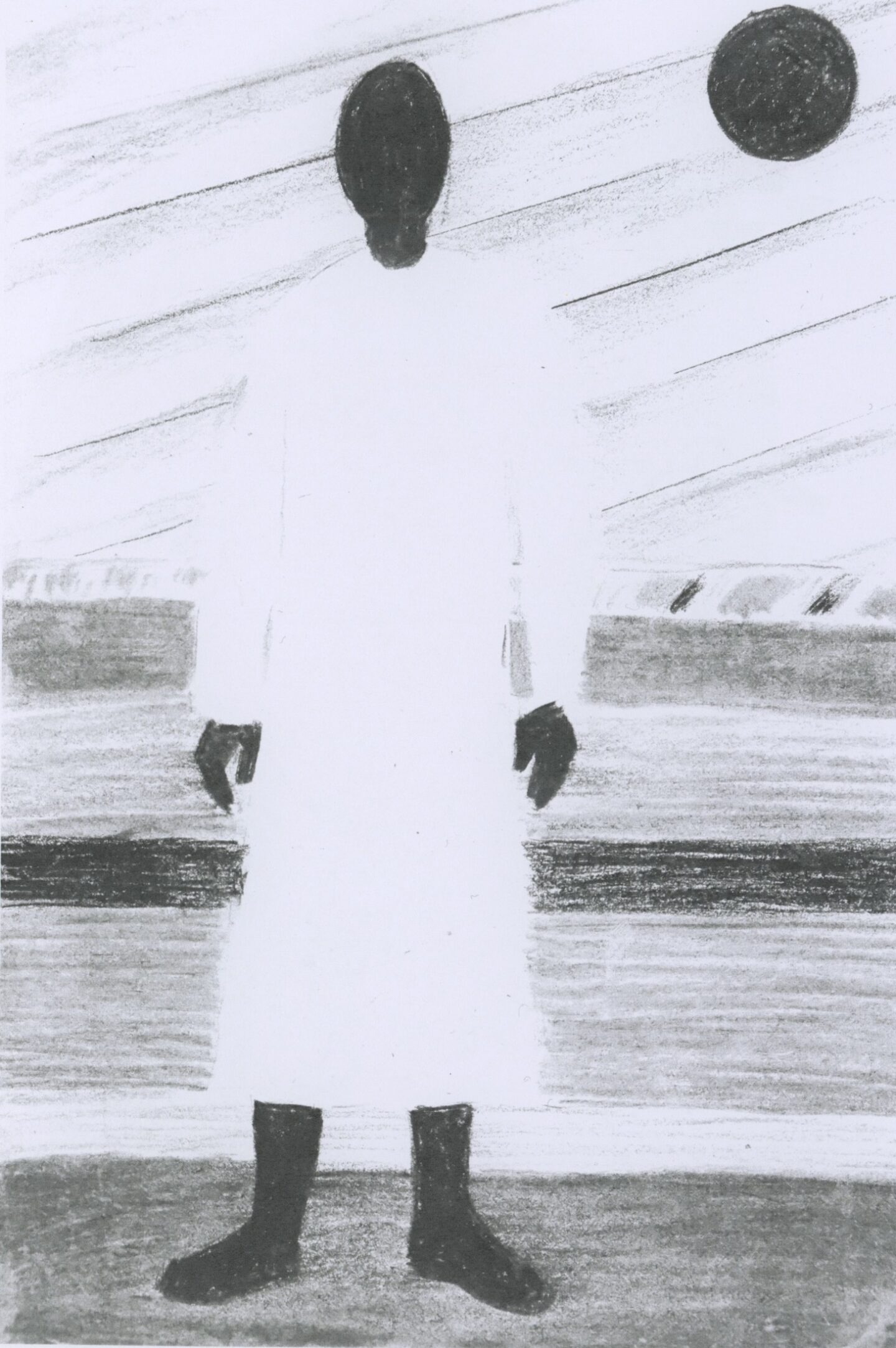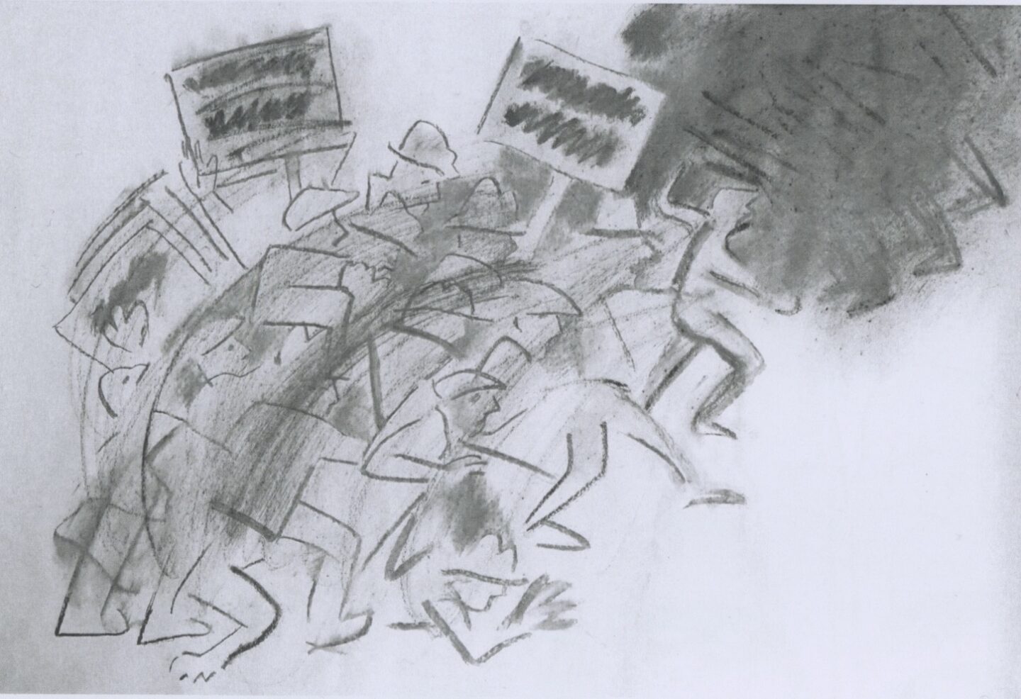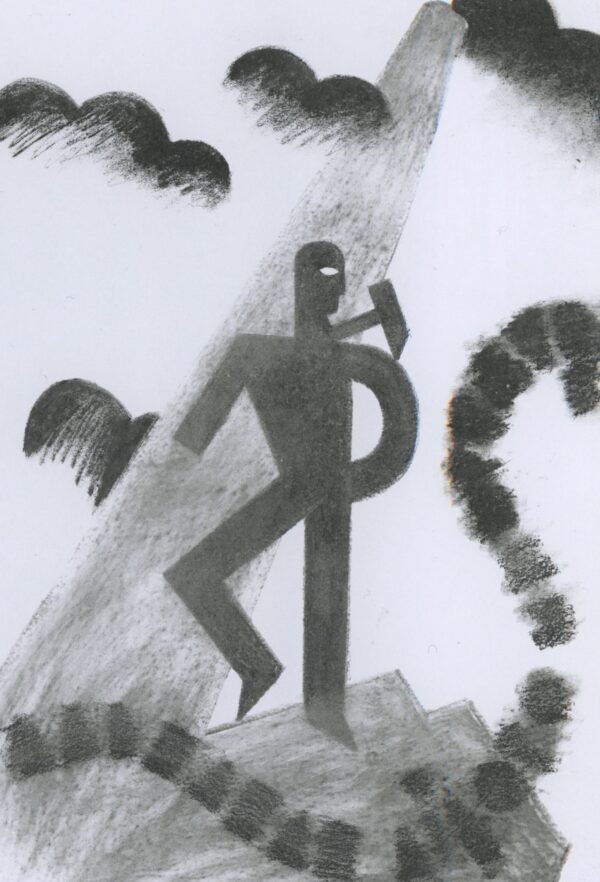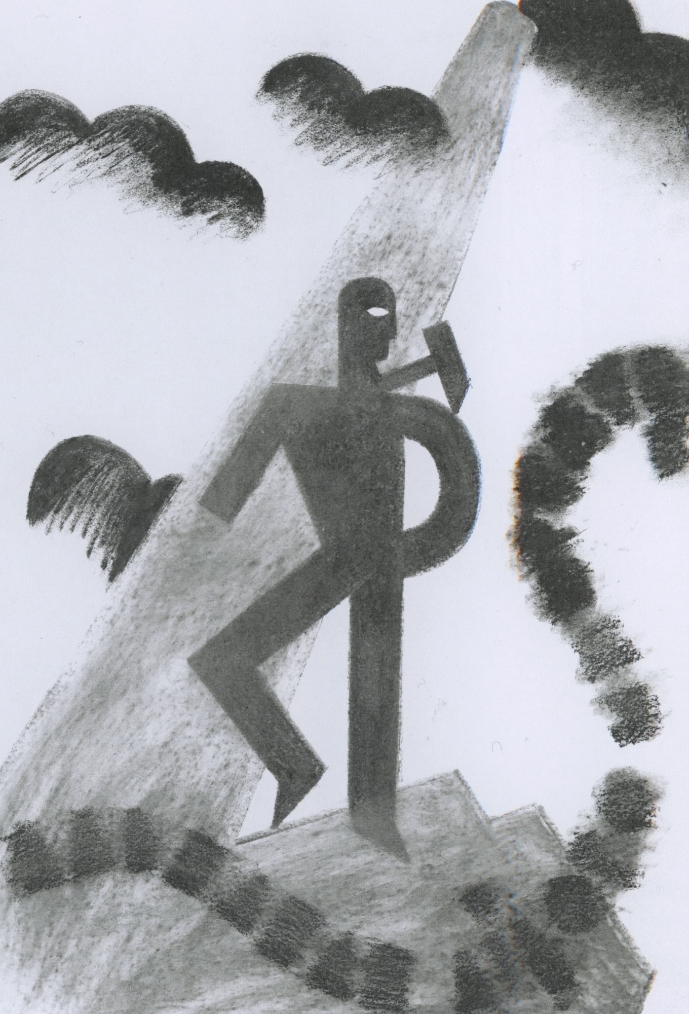 Spośród kilkudziesięciu rysunków wykonanych przez N. to właśnie replika grafiki Światosława Hordyńskiego wydaje się najpełniej oddawać napięcia obecne w jego praktyce artystycznej. Oryginał powstał jako okładka dla Almanachu sztuki lewicowej w początku lat 30. XX wieku. Obraz przedstawia syntetyczną sylwetkę ludzkiej postaci, która robi krok pod górę. Do jego szyi przyciśnięty jest młotek. Głowa jest zwrócona profilem, a białe oko na czarnym tle wygląda jak pusta przestrzeń lub latarka. Na niebie, nad postacią, znajdują się chmury zarysowane ostrymi pociągnięciami węgla. Zza nich na idącego mężczyznę pada jednak bezpośredni snop światła. Klimat tej grafiki koresponduje z ówczesną działalnością publicystyczną Hordyńskiego, który pisał o przeczuciu głębokich przemian politycznych i społecznych zachodzących w latach 30. Trafnie wyczuwał atmosferę ogólnego napięcia, ale i nadziei na postęp, szczególnie w kontekście ukraińsko-polskiego środowiska Lwowa. Wizja postępu zawarta w grafice wyraża się w wizerunku tytanicznej postaci wspinającej się pod górę – bohatera, który zdaje się dźwigać brzemię historii. Umieszczony przy jego szyi symbol młota może być interpretowany jako metafora trudnej sytuacji politycznej, w jakiej znaleźli się galicyjscy artyści.