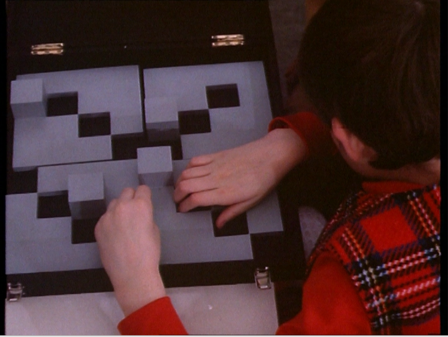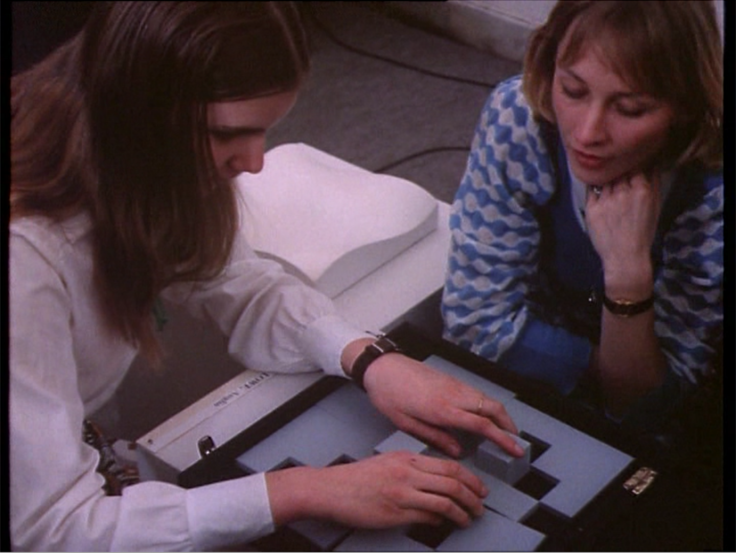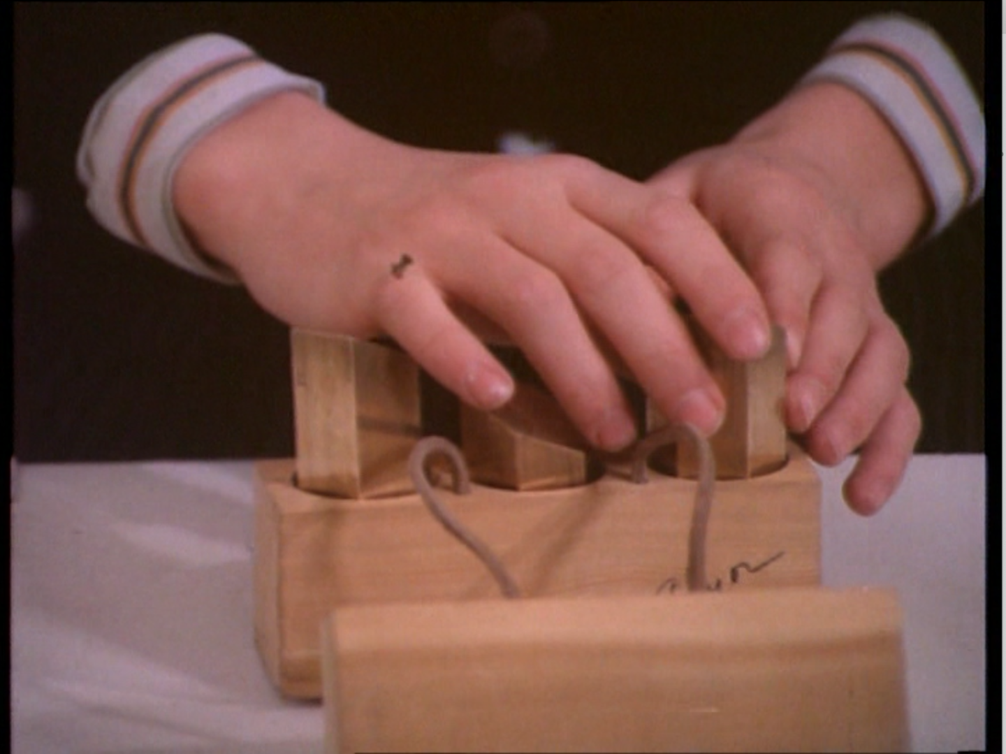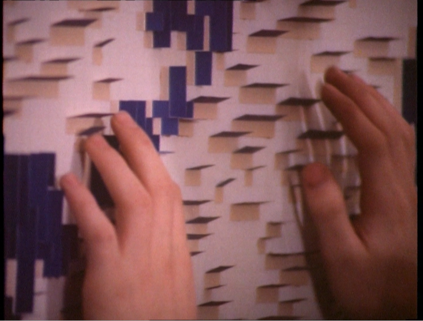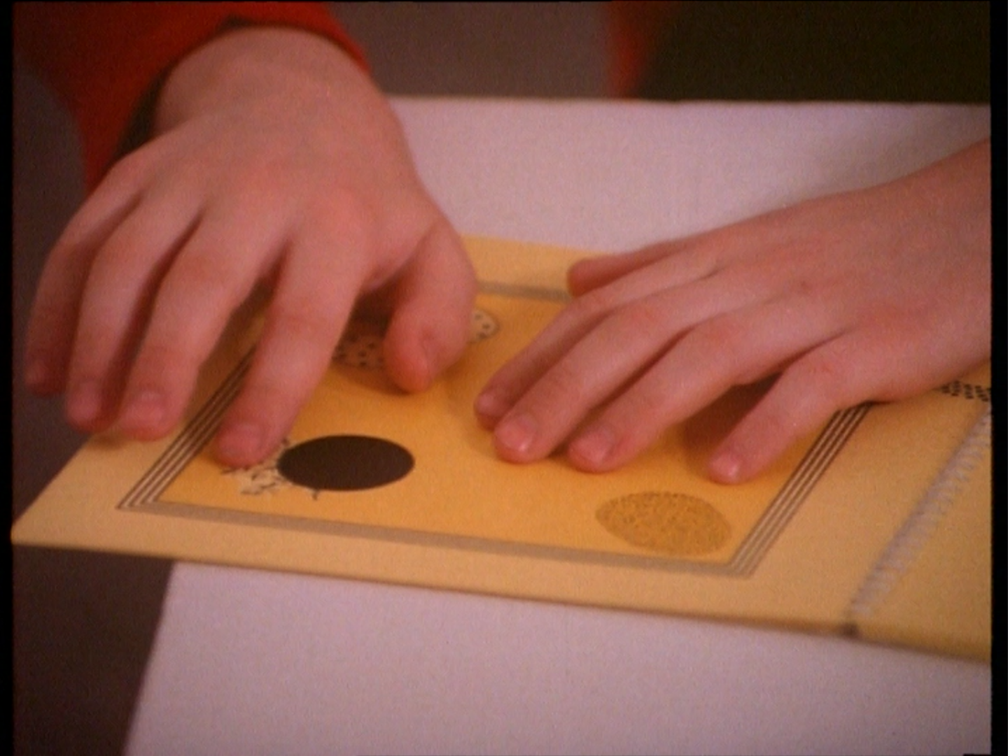 Oprócz scen prezentujących proces poznawania dzieł za pomocą dłoni, odbiorcy filmu konfrontują widziane z bliska, w pełnym kadrze prace, zwłaszcza ich fragmenty z wygłaszanymi przez dzieci bezpośrednimi wrażeniami z ich odbioru. W pierwszym widocznym ujęciu dziecko przesuwa palcami po trzech metalowych klockach związanych z drewnianą postawą (praca Tibora Gayora), co pozwala obserwować percepcję dotykową – najpierw w ciszy i w skupienia, a następnie z dźwiękiem towarzyszącym rozpoznającej manipulacji przedmiotem. W ten sposób, za pośrednictwem działań chłopca, sami poznajemy obiekt. W kolejnej scenie w wiszący warkocz – dzieło Naomi Kobayoshi – inne dziecko wtapia swoje palce, zgina obiekt, łapie jego końce. Cisza przeplata się tutaj z szeleszczącymi dźwiękami wynikającymi z poznawczych działań widza. To udźwiękowienie taktylnej percepcji zostaje wyraźnie zintensyfikowane w odbiorze pracy Winiarskiego. Widoczna w pełnym kadrze, zostaje niejako udźwiękowiona przez wyraźnie słyszalny szelest wynikający z przemierzania dłonią po trójwymiarowym układzie prostopadle ułożonych, papierowych prostokątów. Słyszymy dotyk, a dźwięk niejako przenika do struktury obrazu18. Najbardziej radykalnym rozwiązaniem pozostaje jednak pojawiający się wielokrotnie czarny ekran.